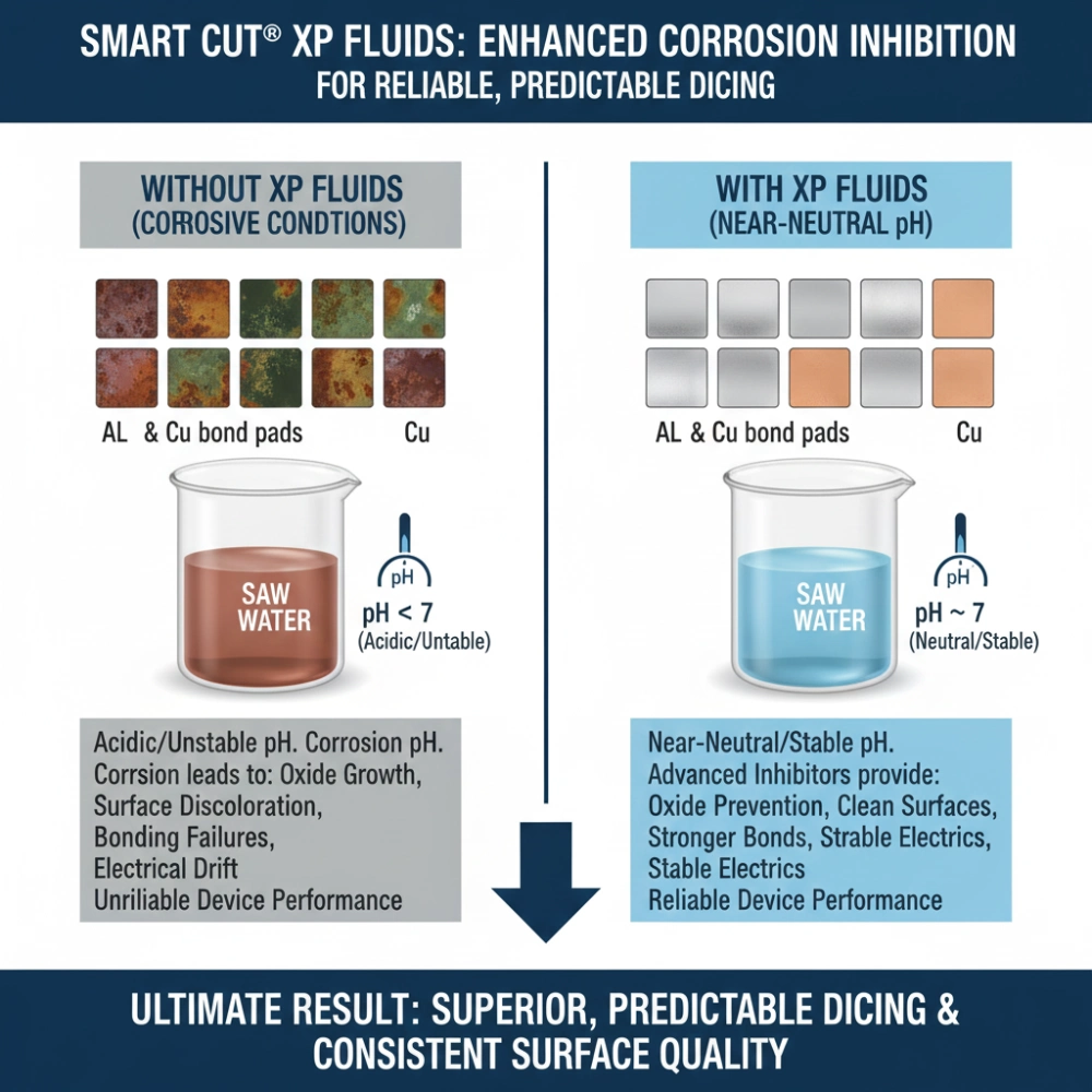 The solution maintains a near-neutral pH, protecting delicate materials and ensuring stable chemistry during long cutting runs. SMART CUT® XP fluids contain advanced corrosion inhibitors that make the coolant fully non-corrosive to the metal alloys commonly used in semiconductor packaging. This prevents oxide growth on Al and Cu bond pads, stops surface discoloration, and reduces bonding failures caused by corrosion-driven contamination. Consistent surface protection also limits electrical parameter drift and helps maintain reliable device performance, even under high-temperature or extended recirculation conditions.