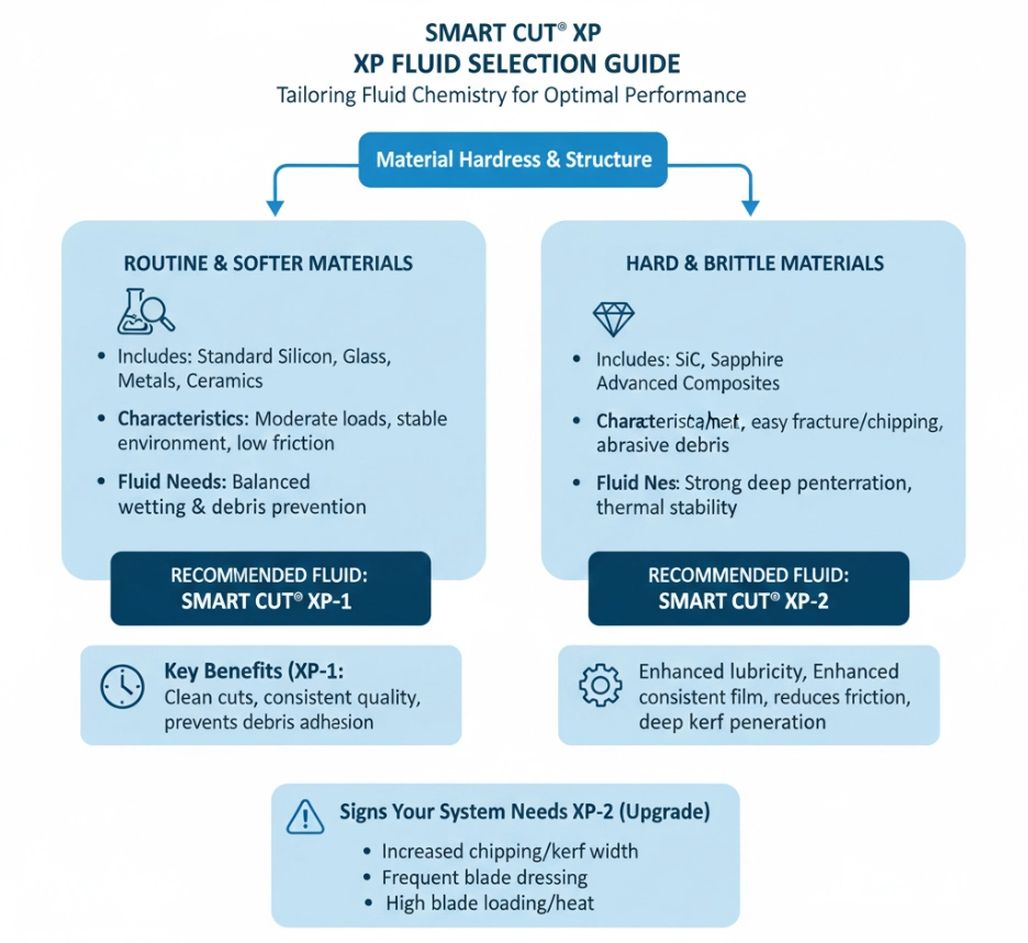 Material hardness and structure have a direct impact on selection. Hard and brittle materials require strong lubrication and deep fluid penetration to prevent micro chipping and maintain kerf accuracy. Softer or thinner materials require stable wetting and consistent cooling. XP-1 and SMART CUT Water Soluble Coolant meet these needs. XP-2 supports higher friction conditions found in advanced ceramics and composites. XP-3 maintains flow stability in high pressure systems. XP-4 provides static control for electrostatic sensitive devices.