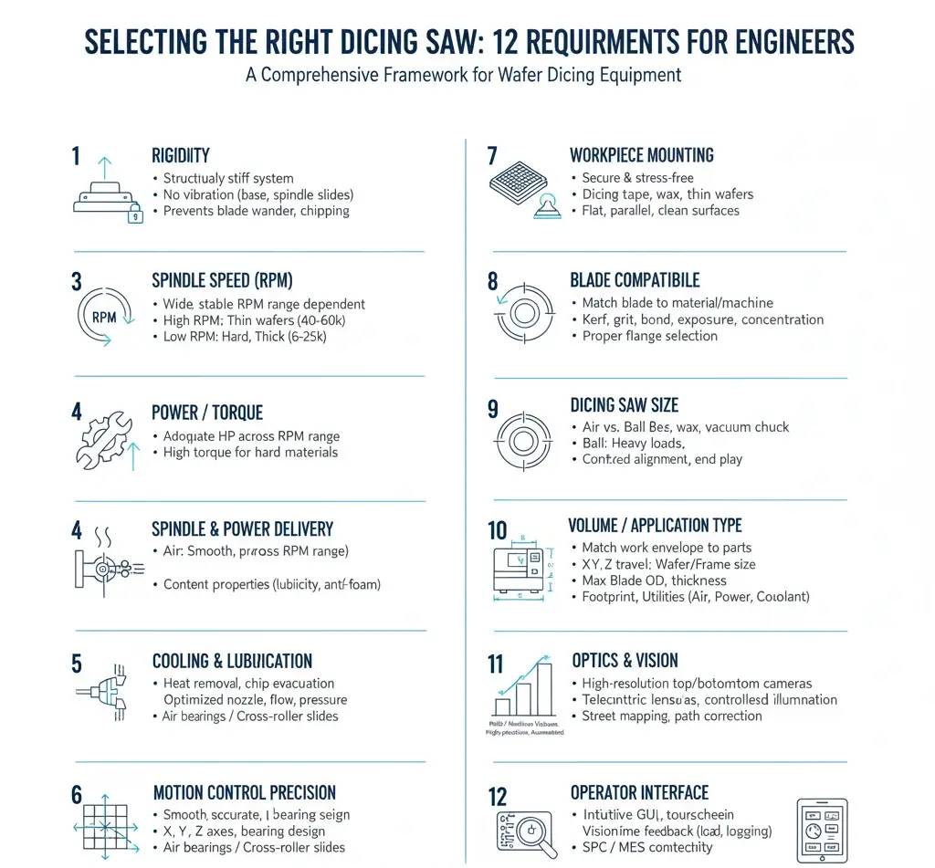 A high-performance wafer dicing process depends on more than just a dicing blade with properly exposed diamond crystals and a stable machine. For consistent results, the system must satisfy several fundamental requirements. Traditionally, these were summarized as rigidity, power, and cooling, but modern applications demand a broader view. The following twelve requirements provide a more complete framework for selecting and operating wafer dicing equipment.