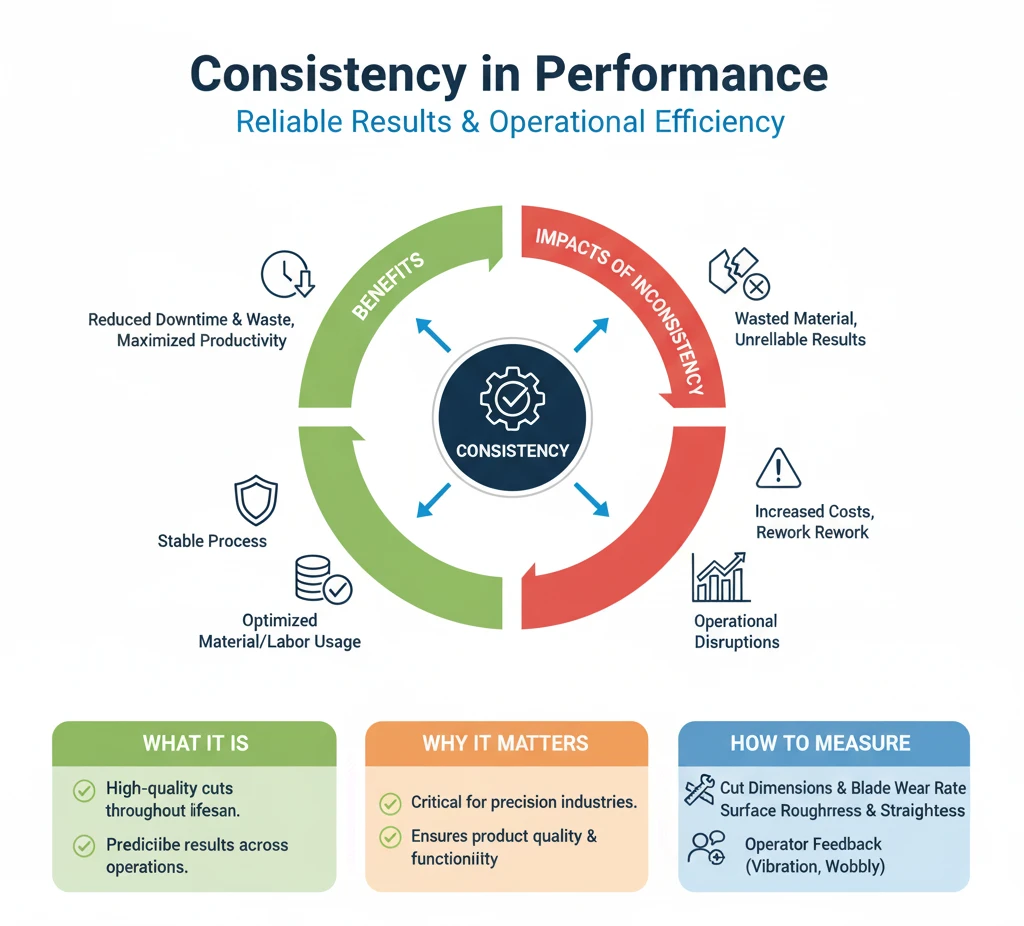 Consistent blade performance is essential for operational efficiency, reducing the need for frequent adjustments and calibrations, thus minimizing downtime and maximizing productivity. In high-volume cutting environments, this ensures that each cut meets the required specifications, reducing the likelihood of defective products and rework. Inconsistent blades can lead to increased costs due to material waste and higher labor costs for inspecting and correcting cuts. Consistent blades maintain uniform quality, optimizing material usage and labor efficiency.