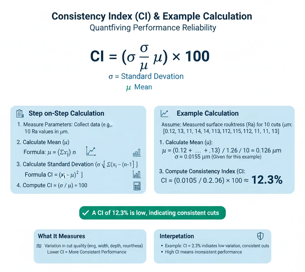 The Consistency Index can be calculated using the standard deviation of a set of measurements related to cut quality, such as cut width, depth, or surface roughness, over a series of cuts.