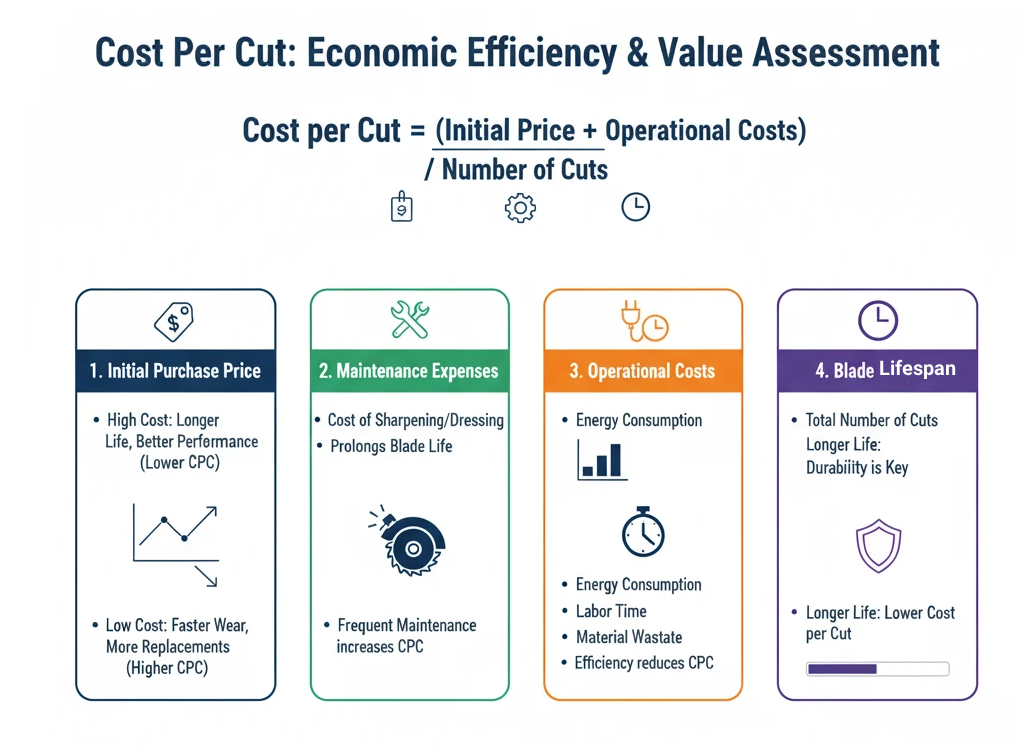 Dependent on Blade Life and Cutting Conditions: Optimizing blade life and operational parameters reduces cost per cut, enhancing economic efficiency. |