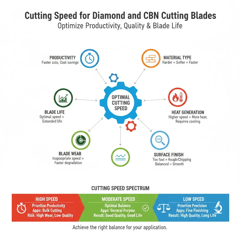 The blade's diameter, bond type, kerf thickness, diamond size, concentration, and bond hardness all influence the ideal cutting speed. For instance: