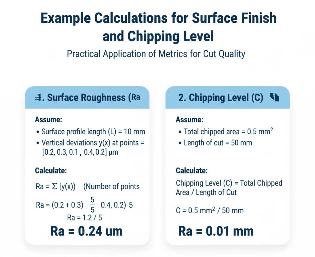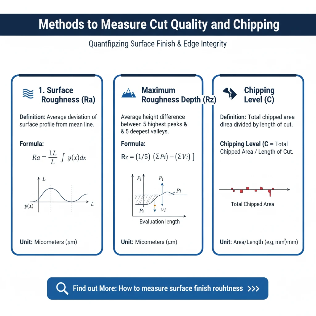 Chipping level can be assessed by measuring the number and size of chips along the cut edge. One approach to quantifying chipping level is to use a chip density metric, which can be expressed as the total chipped area divided by the length of the cut.