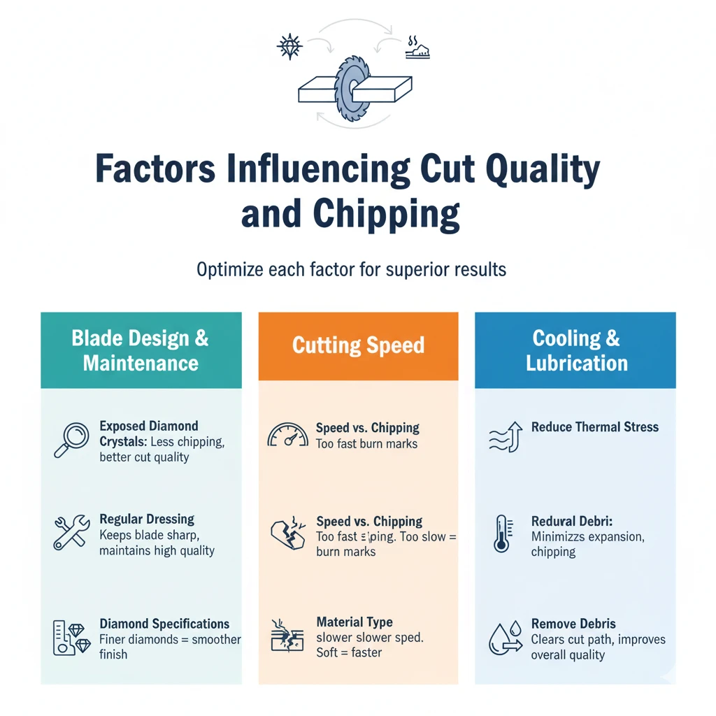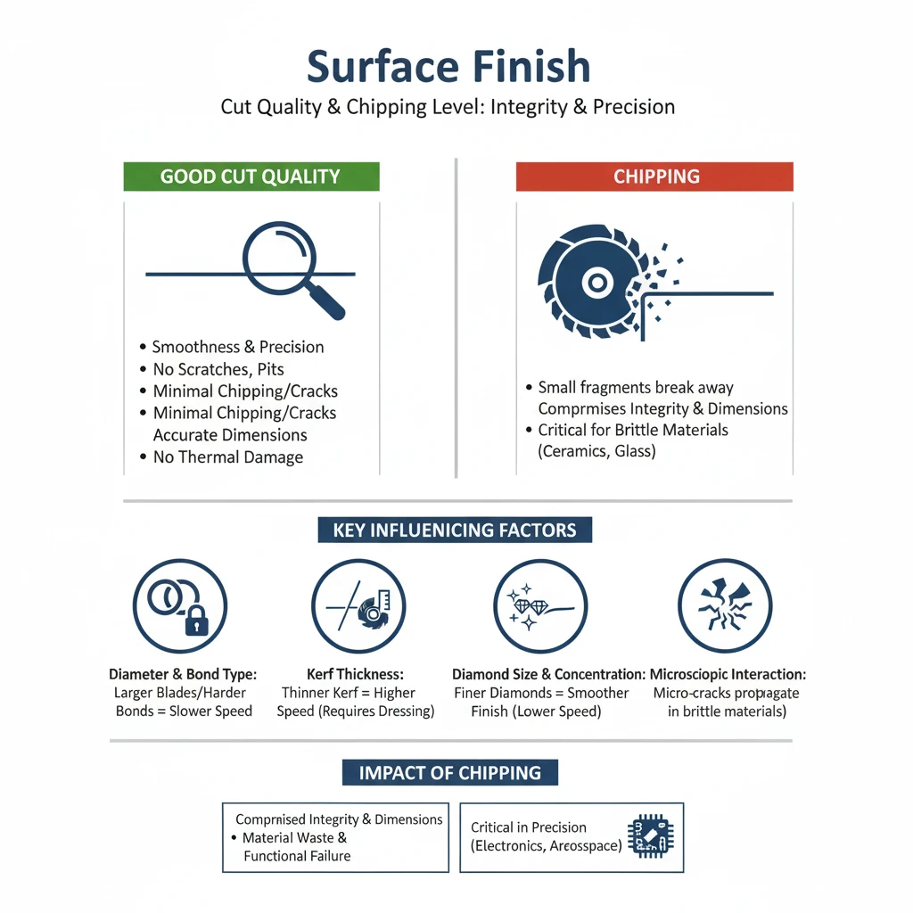 Cut quality and the level of chipping are critical performance indicators for diamond and CBN cutting blades across a wide range of applications, The accuracy of the cut can significantly impact the usability and integrity of the material being processed. High-quality cuts are characterized by their cleanliness and minimal finishing required post-cutting, whereas chipping involves small fragments of the material breaking away during the cutting process, compromising the integrity and dimensions of the final product.