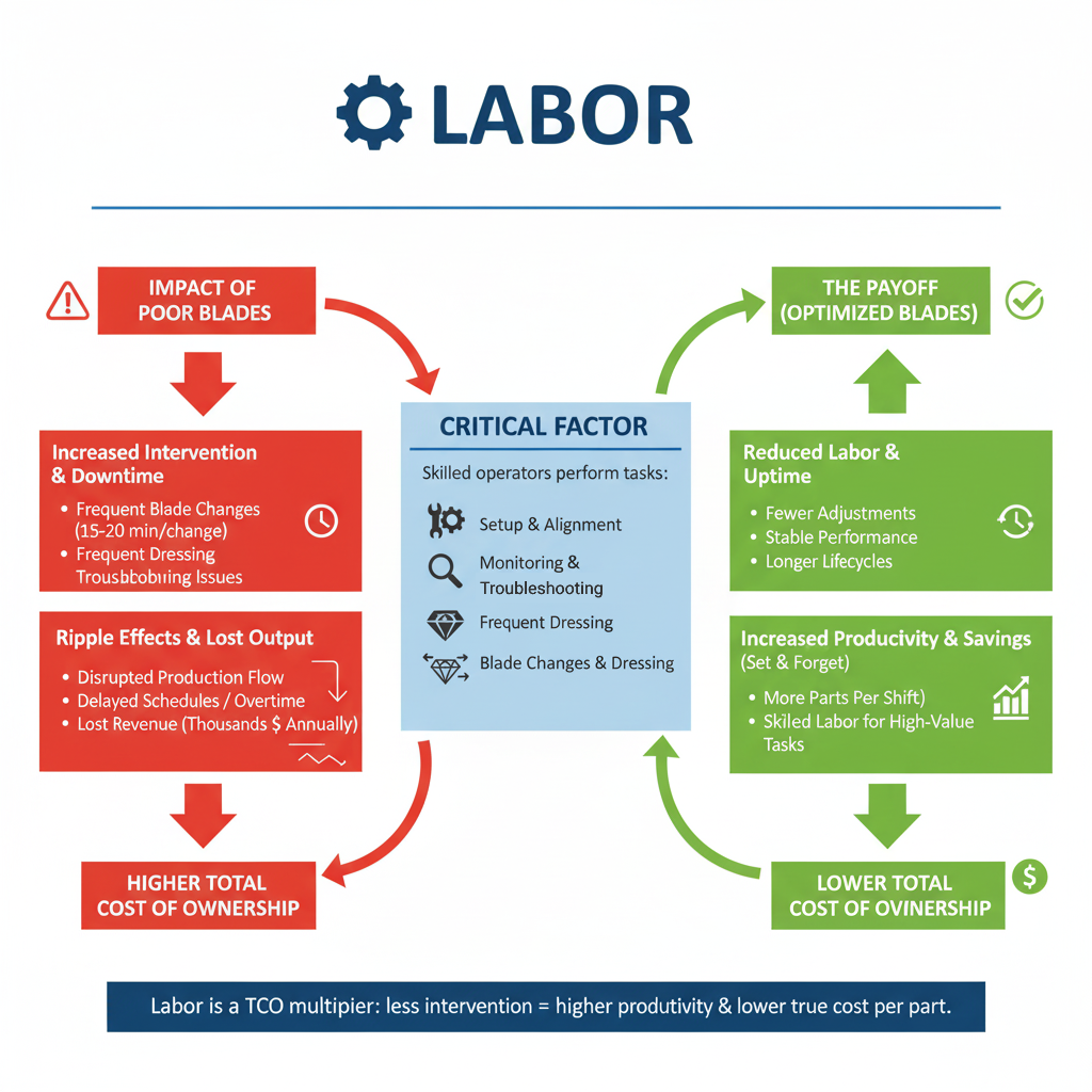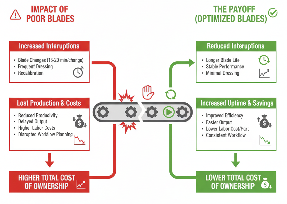- Downtime – blade changeovers, dressing, and machine setup.