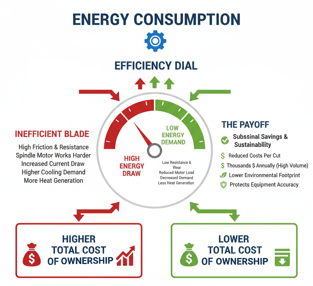 Blades with poor cutting efficiency generate more friction and resistance during operation. This forces the spindle motor to work harder, drawing more current and producing excess heat. Higher friction also means more cooling power is required to prevent thermal damage, increasing the load on pumps and coolant circulation systems. Together, these factors elevate energy consumption and raise the cost per cut.