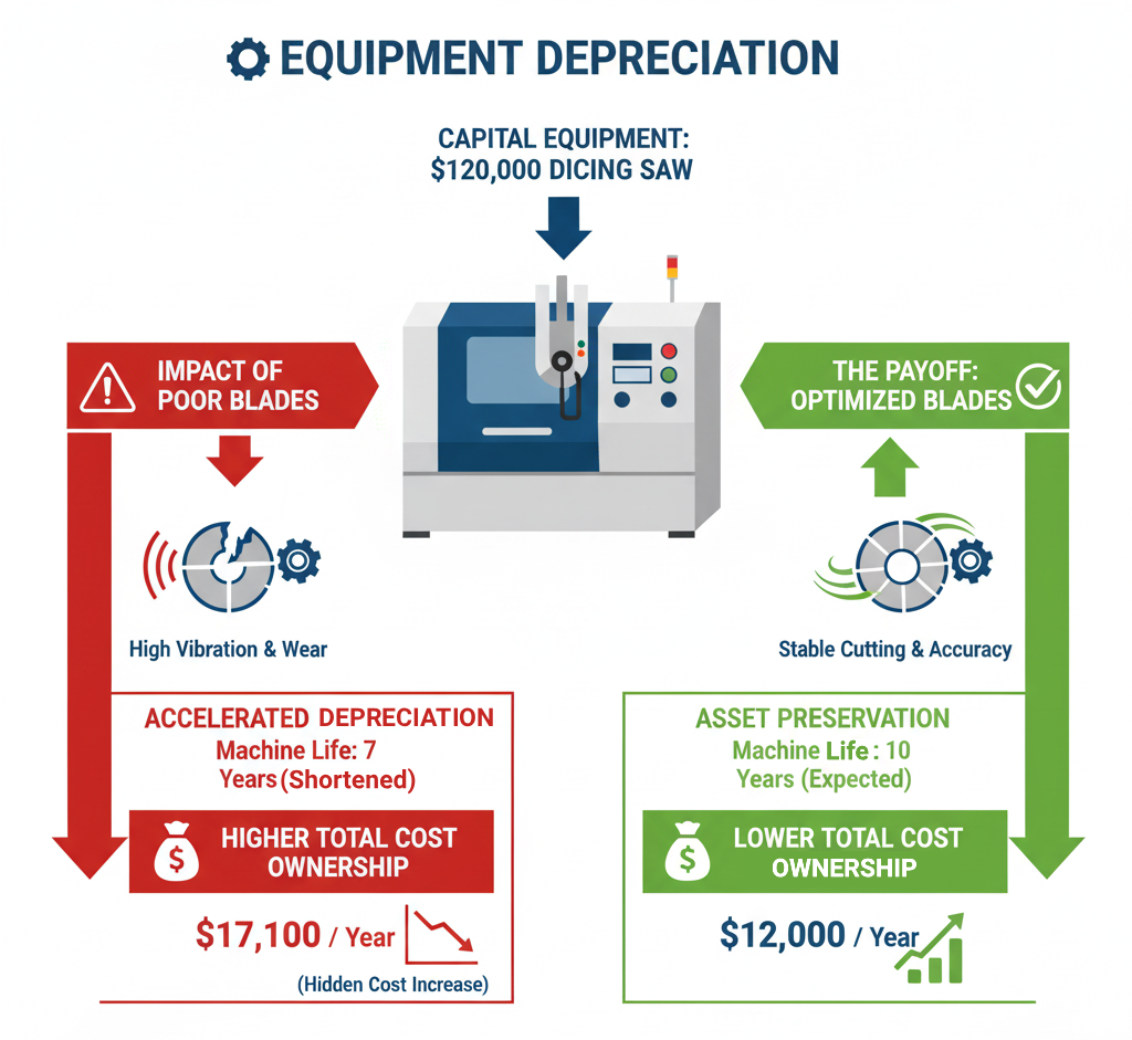 With new dicing machines costing $100,000 to $150,000, the financial impact of accelerated wear is substantial. If a $120,000 dicing saw is depreciated over 10 years, that equals $12,000 per year in depreciation. However, if poor blade selection or unstable cutting shortens the machine’s life to 7 years, annual depreciation effectively rises to $17,100 per year. That hidden increase of over $5,000 per year can outweigh any perceived savings from using cheaper or less suitable blades.
