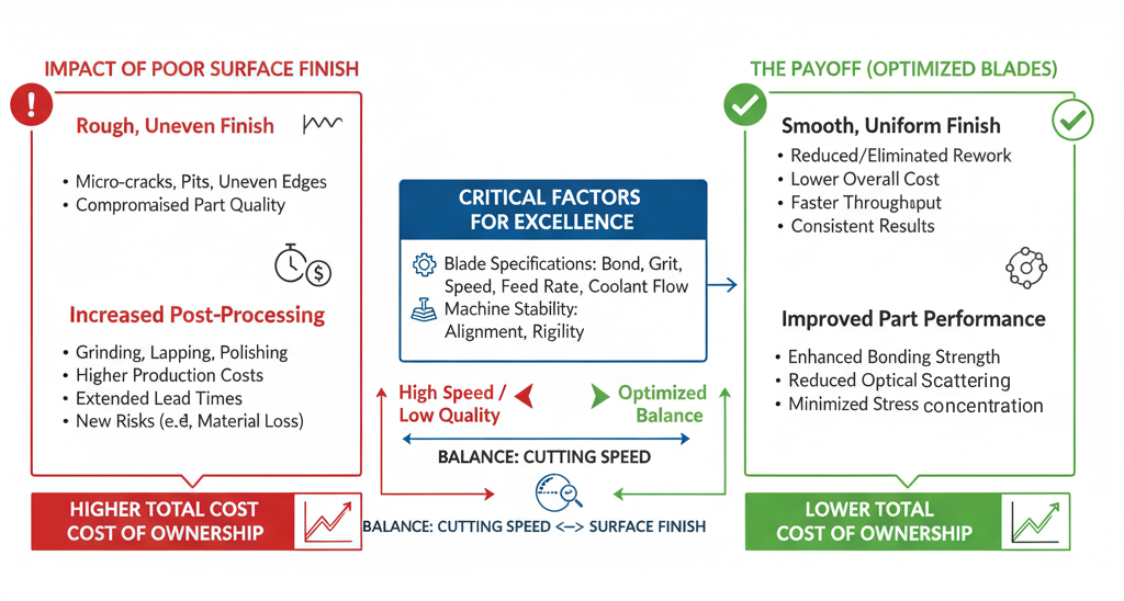 When the surface finish is poor, additional post-processing becomes necessary. Steps such as grinding, lapping, or polishing are required to bring the surface back to specification. These operations not only increase production costs but also extend lead times and introduce new risks, such as over-polishing or additional material loss. In high-precision industries like semiconductors, photonics, and advanced ceramics, the expense and delays caused by secondary operations can outweigh any savings from using a cheaper blade.