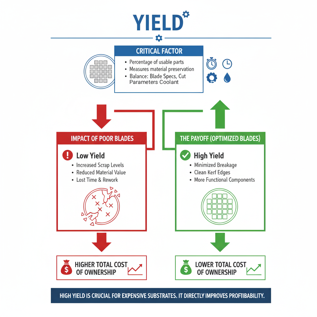 Yield is the percentage of usable parts that remain after dicing. It is a direct measure of how effectively a diamond dicing blade preserves material during the cutting process. A higher yield means more functional components from the same wafer or substrate, which directly improves profitability.