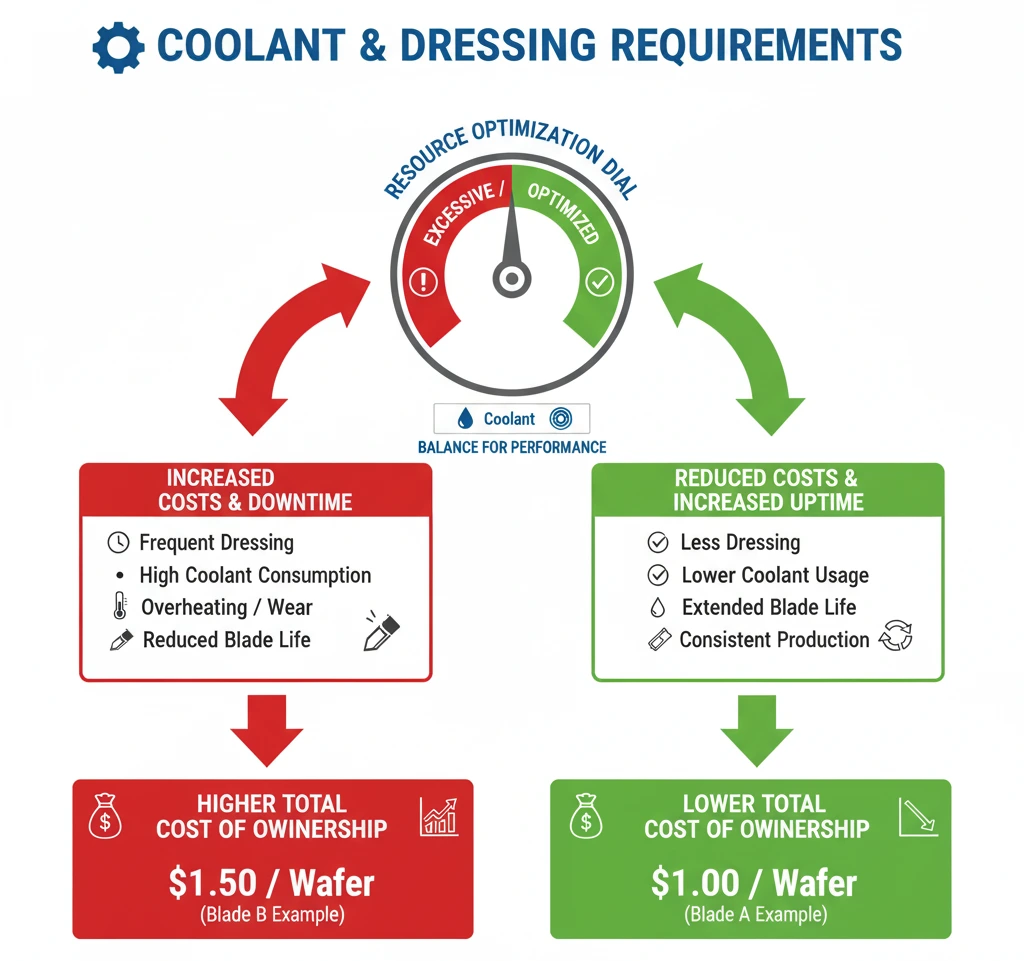 When evaluating the total cost of cutting, coolant consumption and dressing frequency must be included alongside blade life and yield. A blade that requires less coolant and fewer dressing cycles may have a higher purchase price but will lower the overall cost of ownership by reducing consumable usage, labor, and lost machine time.