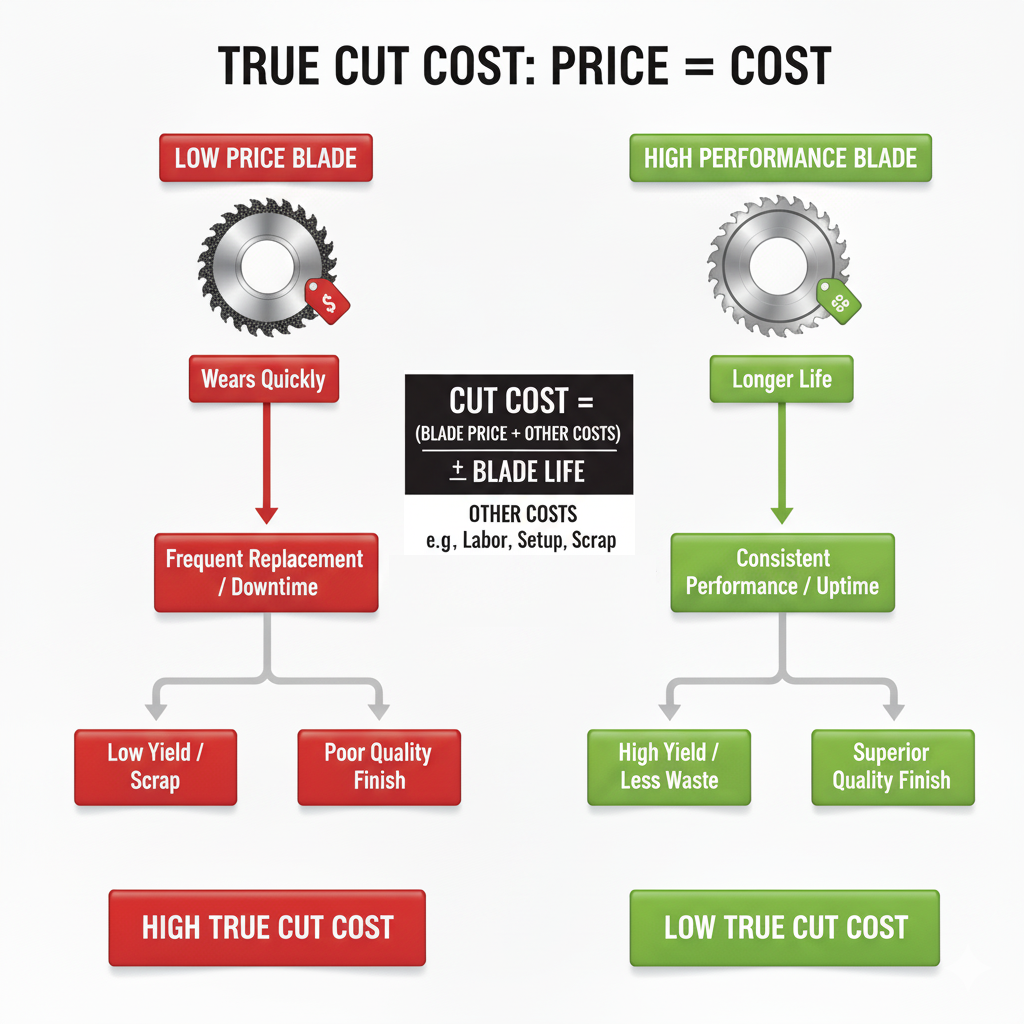 Focusing only on purchase price hides these important factors. A blade that delivers longer life, higher yield, and consistent results will always lower your true cut cost, even if it has a higher initial price.
