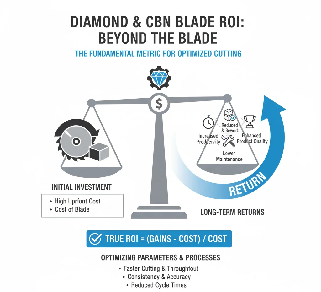 Considering and calculating Return on Investment (ROI) is important for making informed, cost-effective decisions. While high-quality diamond and CBN cutting blades have a higher upfront cost, their durability, performance, and efficiency often lead to significant long-term savings. Evaluating ROI highlights financial benefits such as increased productivity, reduced waste, and lower maintenance costs..