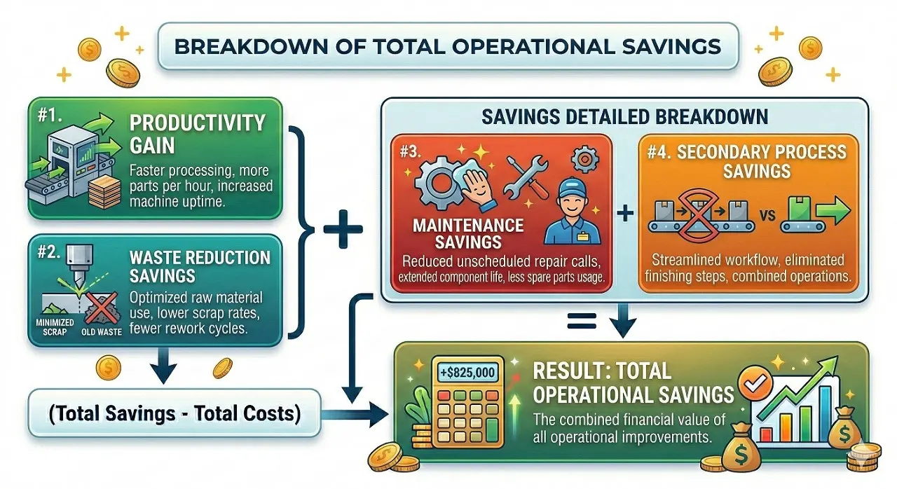 Total Operational Savings = Productivity Gain + Waste Reduction Savings + Maintenance Savings + Secondary Process Savings