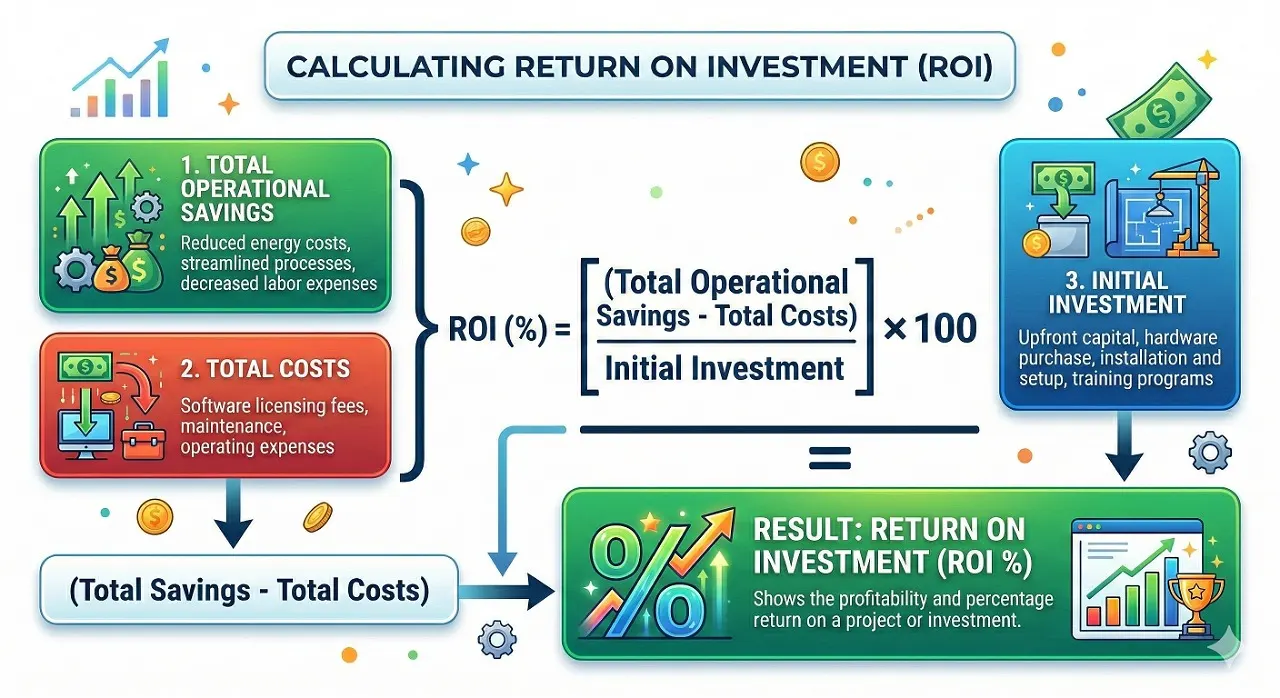 ROI (%) = [(Total Operational Savings - Total Costs) / Initial Investment] × 100