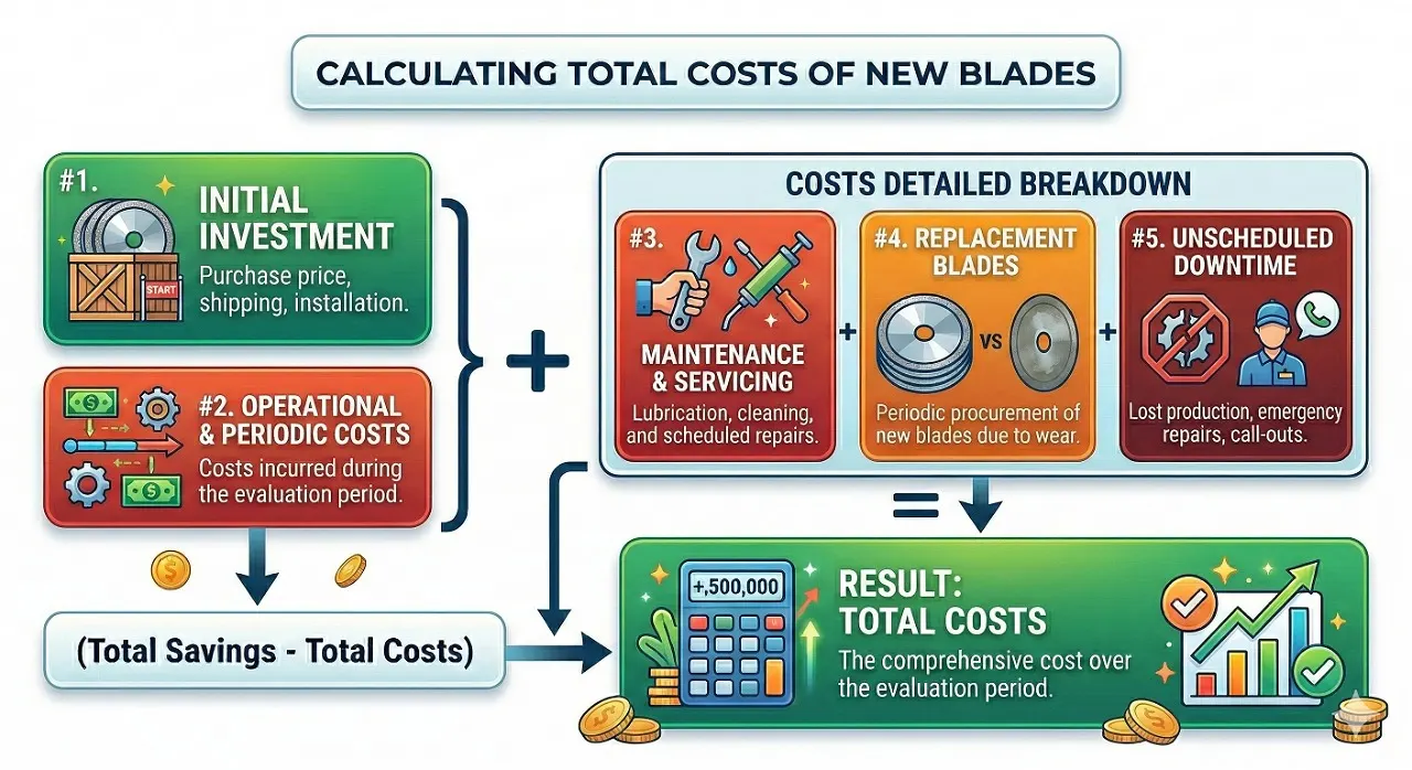 Determine the total costs associated with the new blades, including maintenance, replacements, and downtime over the evaluation period.