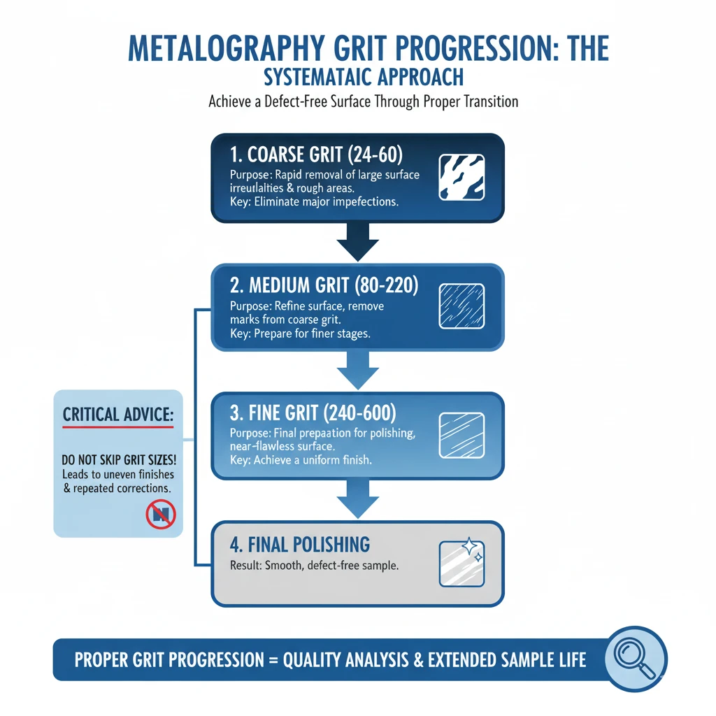 Fine (240-600 grit): Prepares the sample for final polishing by leaving an almost flawless surface.