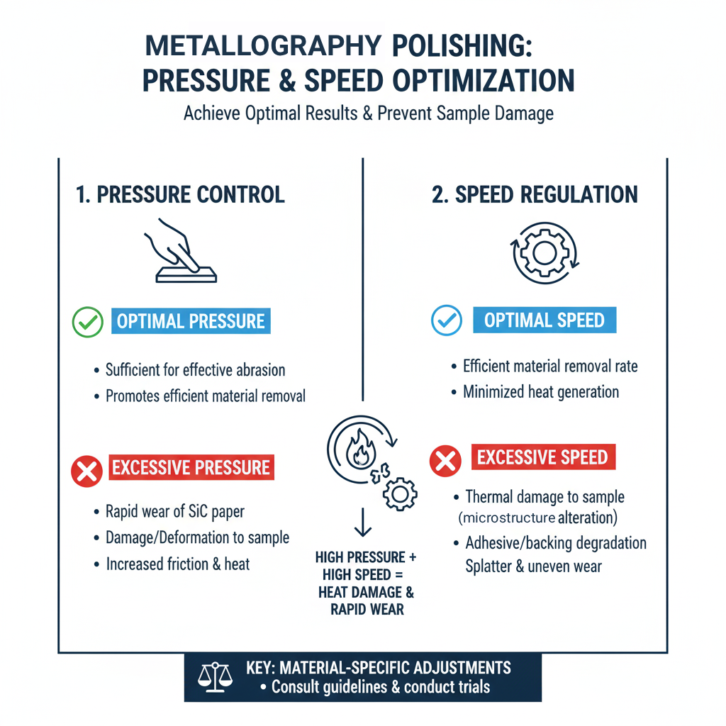 Adjusting the pressure and speed during the polishing process is critical to achieving optimal results. The amount of pressure applied should be enough to facilitate effective abrasion but not so high that it causes excessive wear or damage to the silicon carbide paper and the sample. Similarly, the speed of the polishing tool should be set to a level that allows for efficient material removal without generating excessive heat. High speeds, combined with too much pressure, can lead to thermal damage to both the sample and the abrasive paper. Each material may require different settings, which should be determined based on experimental results or established guidelines.