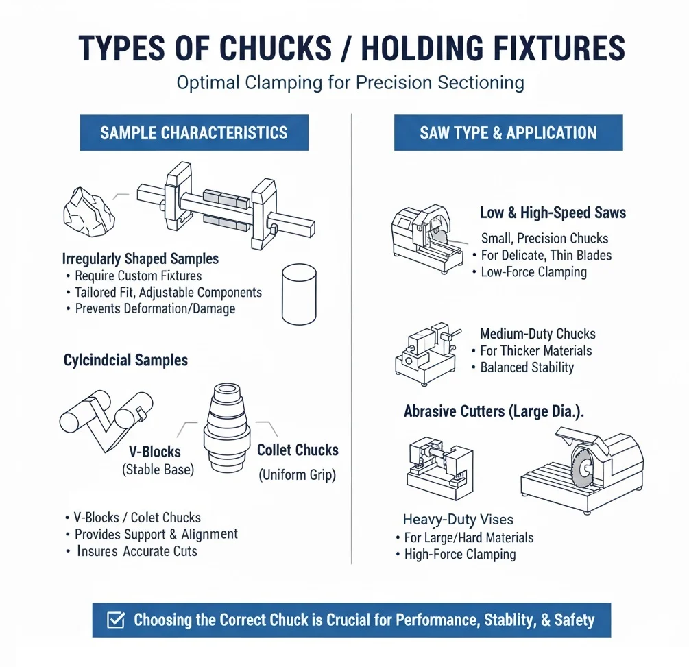 The choice of chuck or holding fixture must account for the specific characteristics of the sample to ensure optimal clamping and cutting performance. Different materials and geometries require tailored approaches to secure them effectively during the sectioning process. Additionally, different types of saws—low and high-speed saws, medium-speed sectioning/wafering saws, and metallographic abrasive cutters for larger diameters—require specific chucks designed for their operational characteristics.