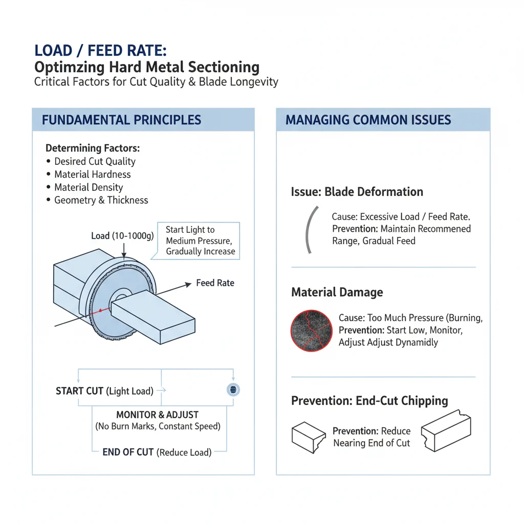 Gradual feed rate and appropriate load prevent blade bending and warping |