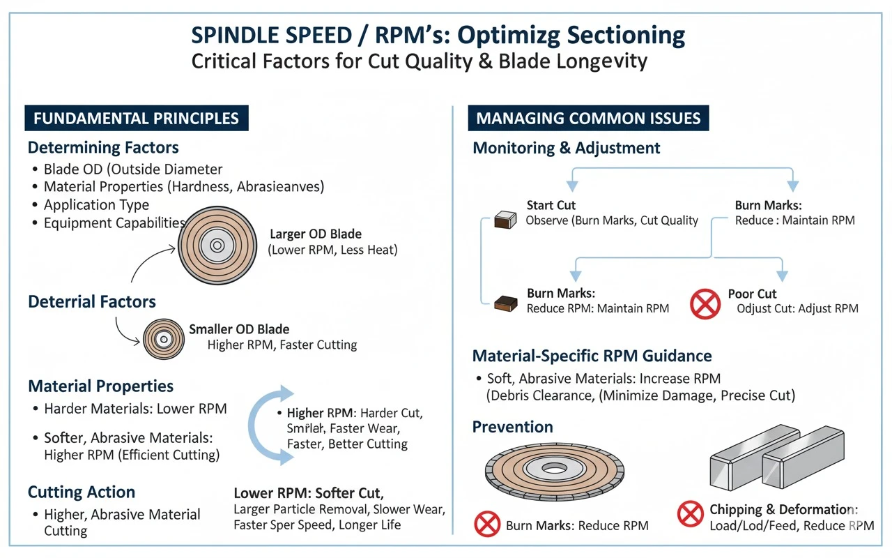 Spindle speed (RPM) is a critical factor for diamond and CBN wafering blades in metallography and sample preparation. Optimal speeds vary based on the blade's outside diameter (OD), the specific application, the material being cut, and the equipment used. Achieving the correct RPM is essential as it directly impacts blade life, cut quality, and overall process efficiency.