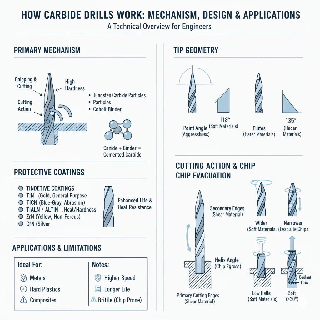 Carbide drills operate by cutting or chipping away at the material. Carbide, recognized for its extreme hardness second only to diamond, is typically tipped or brazed onto the cutting edges of the drill bit. These drills are designed with a solid tip that penetrates into the material, efficiently cutting through it to create chips or fragments.